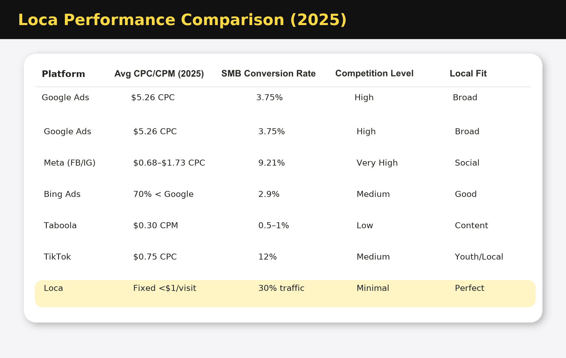 This article breaks down the root causes of these price shocks, real impacts on businesses like yours, proven google ads alternatives and meta ads alternatives, and your step-by-step roadmap to cost-effective local dominance with Loca, no tech degree required. Ready to reclaim your profits?